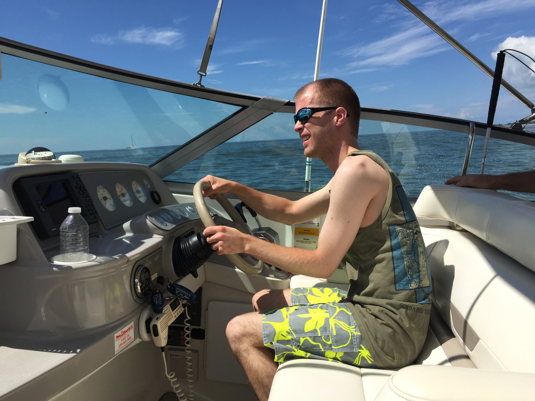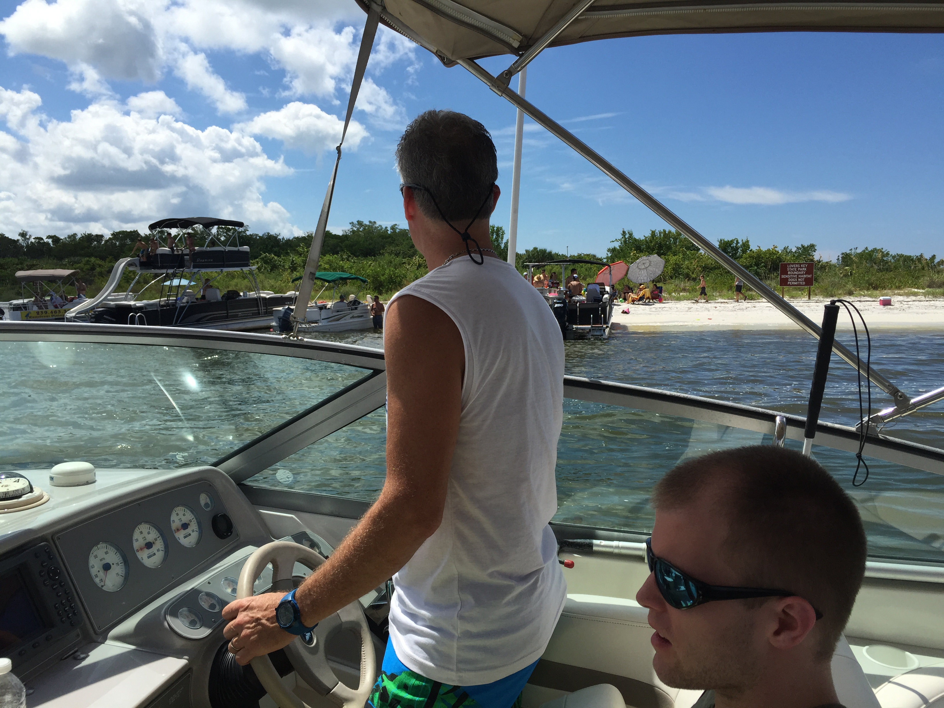 boat-GarrettdrivingAlone_smallEver the jokester, Uncle Mitch (or “Munkle Itch” as Garrett calls him) put Garrett in the driver’s seat of the boat as we sped across to Estero Island. The joy on Garrett’s face was indescribable. He was actually driving!! He’s always wanted to drive but knows that as a blind man, he probably will never experience that privilege. On this day, however, he…was…driving, grinning from ear to ear! Uncle Mitch sat next to him, occasionally grabbing the steering wheel to correct the boat’s trajectory. Once, Mitch slipped sneakily out of the Captain’s seat away from him and stepped behind where Garrett couldn’t feel his presence. Unaware, Garrett was all smiles, just driving away, having the time of his life. Then, slowly, his left hand reached out exploringly to look for Uncle Mitch…where was he?? The happy grin faded to concern as his hand felt the empty seat! We all laughed and laughed and Mitch quickly joined him in the Captain’s seat again. Priceless.